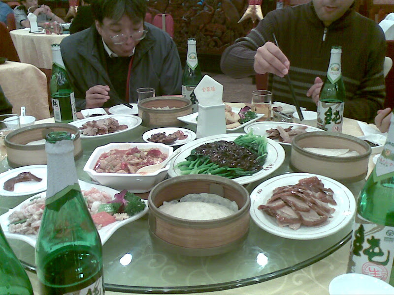 A fogás ízletes volt, és érdekes volt az elkészítése – amelyet mindenkinek magának kellett megtennie. Volt egy palacsinta-szerű tészta, amely azért kevésbé volt olajos, inkább a pitához volt hasonlatos, bár annál lényegesen vékonyabb volt. Ezt kellet megkenni egy finom ,kissé pikáns szósszal, majd zöldhagyma kíséretében került bele a kacsa. Ezután kis falatkára összehajtva, kaptuk a mesés kacsa lakomát. Nekem személy szerint nagyon ízlett és a külön kirendelt egyéb gombás-zöldséges, zöldséges finomságo9k is nagyon ínyemre valóak voltak. Természetesen sört ittunk a fogásokhoz, amely jól illett ehhez az étekhez. A Kínai sörök egyébként meglepően fogyaszthatóak, nyilván az alacsonyabb szintű alkoholnak és a kevésbé kesernyés íznek tudható be. Bár akit az zavar. Engem nem. Úgy tudom egyébként a sört a németek honosították meg errefelé, nagyjából 100 évvel ezelőtt. A fogás mindösszesen 140 Jüan volt fejenként.