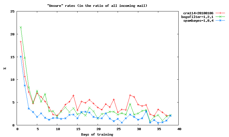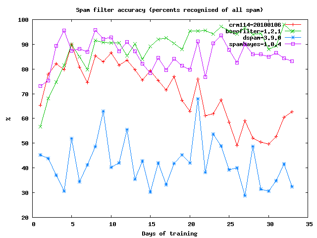 Mint látható, a spambayes, a CRM114 és a bogofilter ígéretesen indult, azonban tartósan a napi 90%-os hatásfok fölé csak a bogofilter tudta magát felküzdeni.