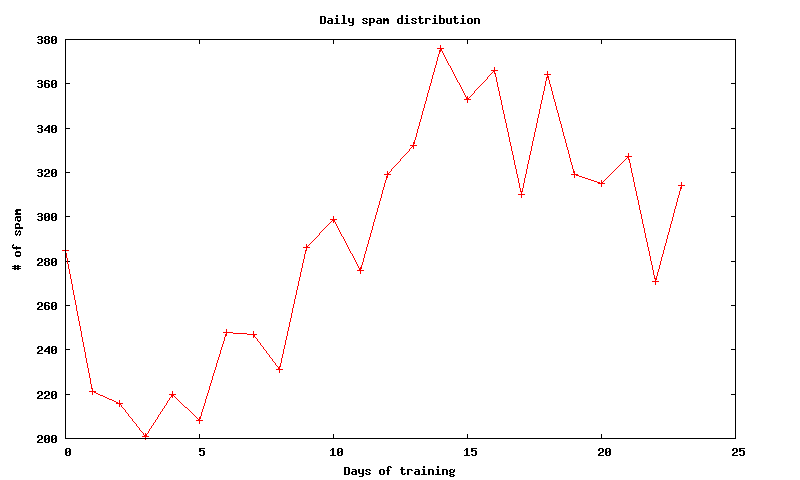 Az első, 33 napos adatgyűjtés során 22016 levelem érkezett, ebből 5849 spam. A számokból látszik, hogy arányaiban véve elég kevés spamet kapok -az iparági becslések jóval 80% feletti spam-fertőzöttségről beszélnek-, napi szinten az arányok a következőképpen néztek ki: