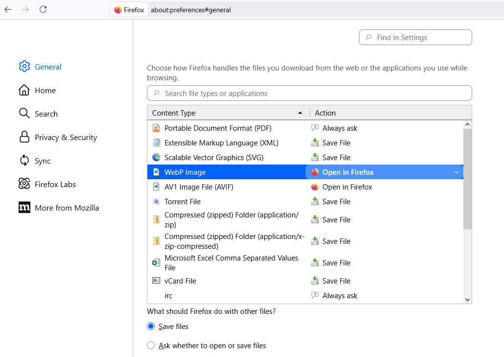 Nem a about:preferences#general alatt van felvéve az application-höz a webp és felülbirálva, hogy mit csináljon vele?