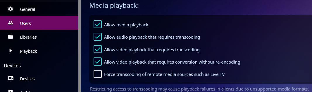 Ami még előnynek tűnik, hogy bár csak lokális hálózati lejátszásra gondoltam az induláskor, ez a felállás lehetővé teszi az interneten keresztüli lejátszást is (például egy reverse-proxy-val: https://jellyfin.org/docs/general/networking/), természetesen az upload függvényében - találtam beállítási lehetőséget a szerverben, "internetes streaming bitráta limit" elnevezéssel ("Ez egy opcionális adatfolyam sebesség korlát a hálózaton kívüli eszközök számára. Ez akkor hasznos, amikor az eszközök magasabb bitrátát kérnek, mint amennyit az internetkapcsolat képes kezelni. Ez megnövelheti a szerver CPU terhelését, hogy átkódolja a videókat egy alacsonyabb bitrátára."). (Hálózat alatt itt a lokális hálózatot érti.)