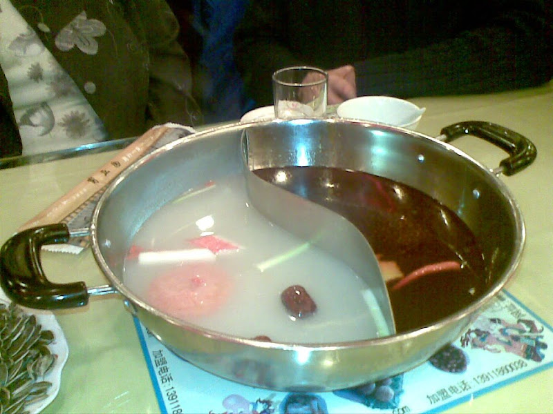 A két alaplé – miképpen a jing és a jang, természetesen – jelentősen eltért egymástól: az egyik csípős volt, de nagyon – szecsuani, a másik pedig édeskés volt, datolyára emlékeztető gyümölcsökkel dúsítva.