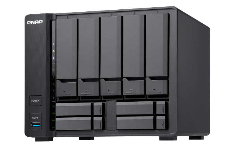 A sorban a harmadik, ugyancsak 9 lemezes (5 x 3,5" és 4 x 2,5"), TS-963X típusjelzésű NAS-nál már más központi egységre bízta a számítási feladatok elvégzését a QNAP. Ebben az esetben az AMD a beszállító, a GX-420MC négymagos processzor pedig 2 GHz-es órajelen üzemel, miközben támogatja az AES titkosítás hardveres gyorsítását is, amit természetesen a tároló ki is használ. A gyártó ezt a NAS-t is 2 vagy 8 gigabájt memóriával szállítja, amely ugyancsak 16 gigabájtig bővíthető. A tároló hátoldalára egyetlen 10GbE képes hálózati port került, ugyanakkor a másik két modellhez viszonyítva különbség, hogy SFP helyett itt RJ45-ös aljzat formájában került fel a hátlapra a csatlakozó. A TS-963X kezdőárát nettó 659 euróban szabta meg a QNAP.